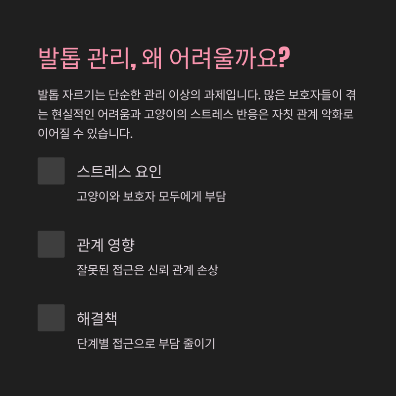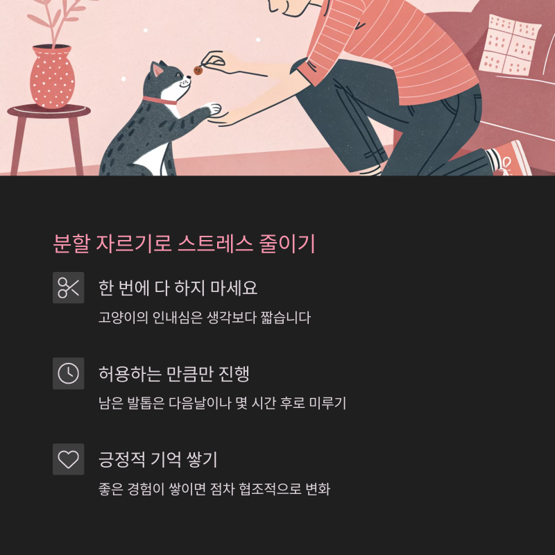 | 처음부터 거부 반응 | 하루 한 발톱씩만 접근 | 인내심과 반복 연습 |