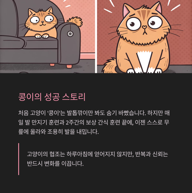 고양이의 협조는 하루아침에 얻어지지 않지만, 반복과 신뢰는 반드시 변화를 이끕니다.