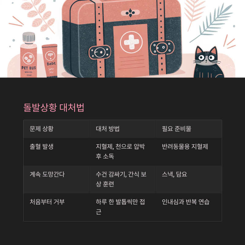 | 출혈 발생 | 지혈제, 천으로 압박 후 소독 | 반려동물용 지혈제 |