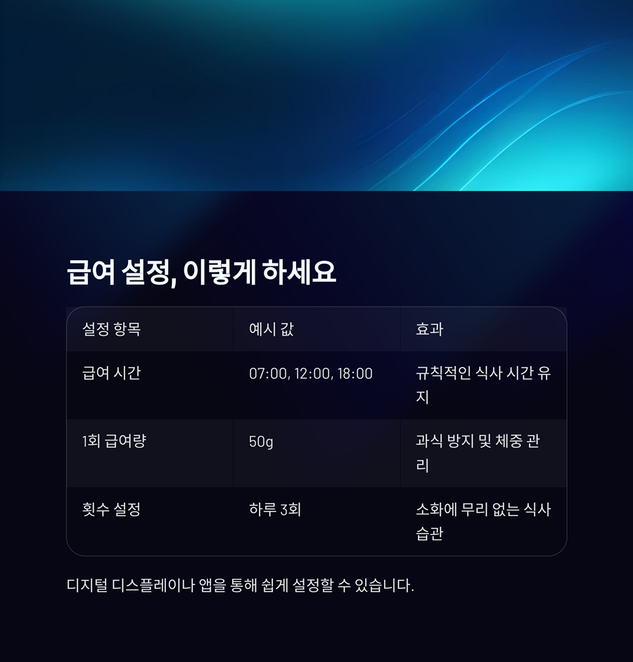 대부분의 자동 급여기는 디지털 디스플레이 또는 앱을 통해 급여 시간과 횟수, 1회당 양을 직접 설정할 수 있습니다.