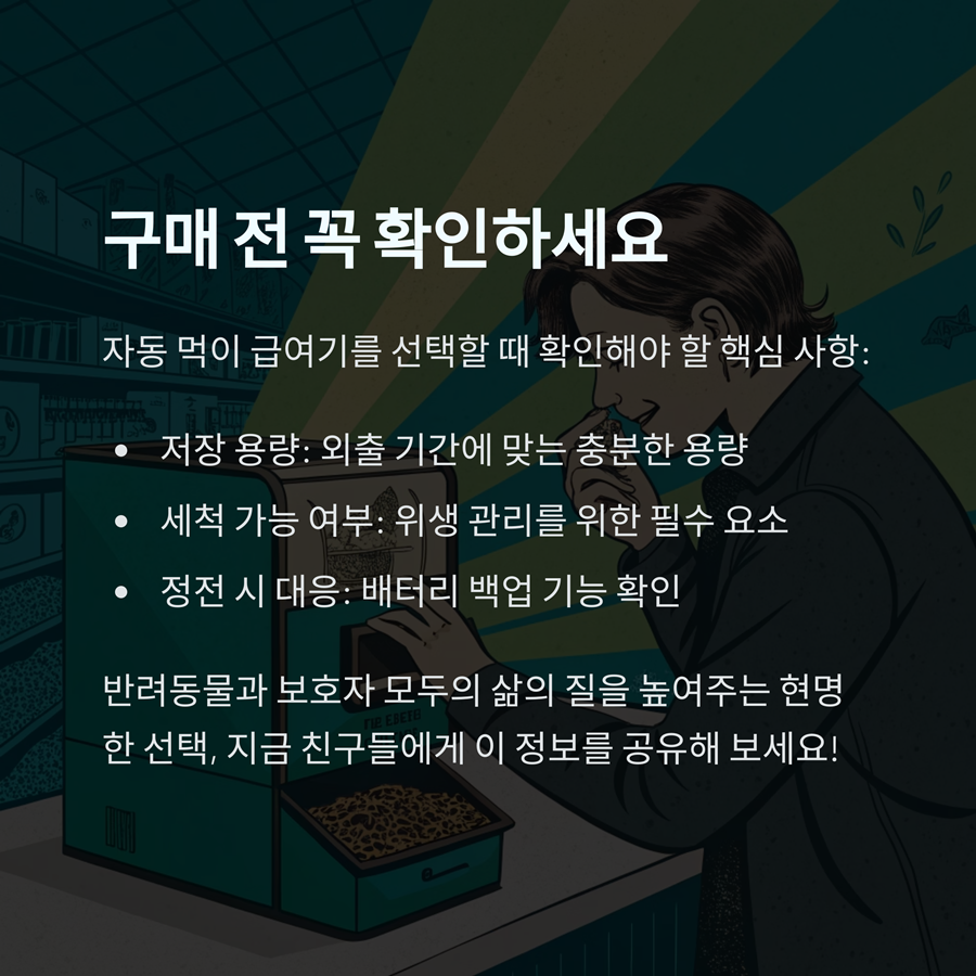 자동 먹이 급여기를 고를 때는 급여량 설정 범위, 급여 횟수, 저장 용량, 청소 용이성 등을 확인해야 합니다.