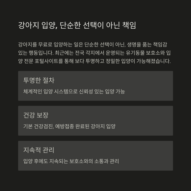 - 입양 전 상담, 임시 보호, 계약 절차를 통해 책임 입양이 가능해졌습니다