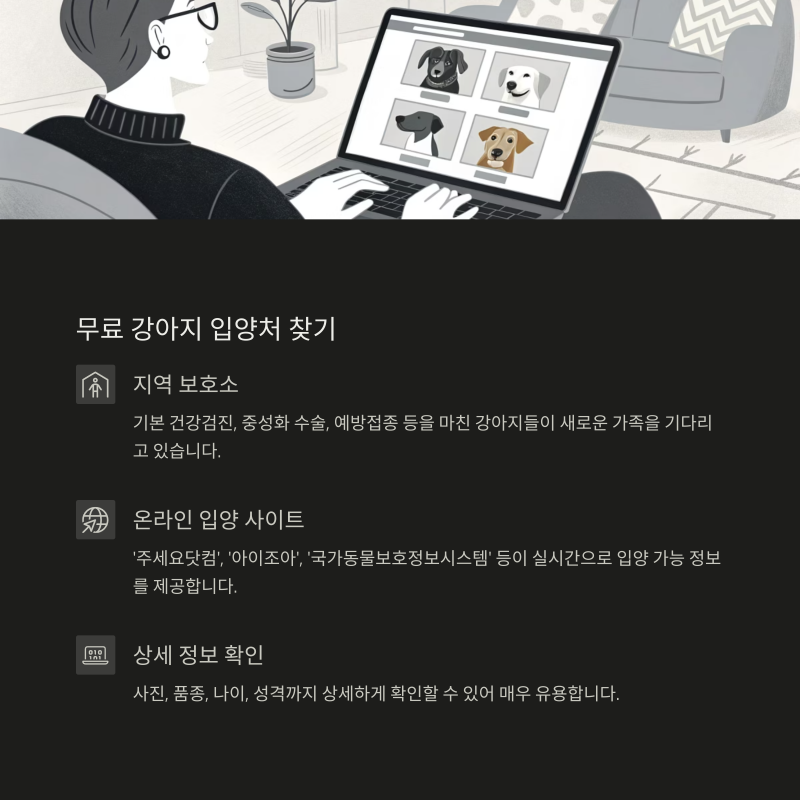 각 사이트는 보호소 소개, 입양 후기, 입양 조건 등 실질적인 도움이 되는 정보 중심으로 구성되어 있어 입양 전 다양한 옵션을 비교해보기 좋습니다.