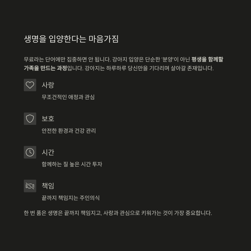 - 생명 입양은 책임감 있는 결정으로, 강아지에게 평생 가족이 되어주세요