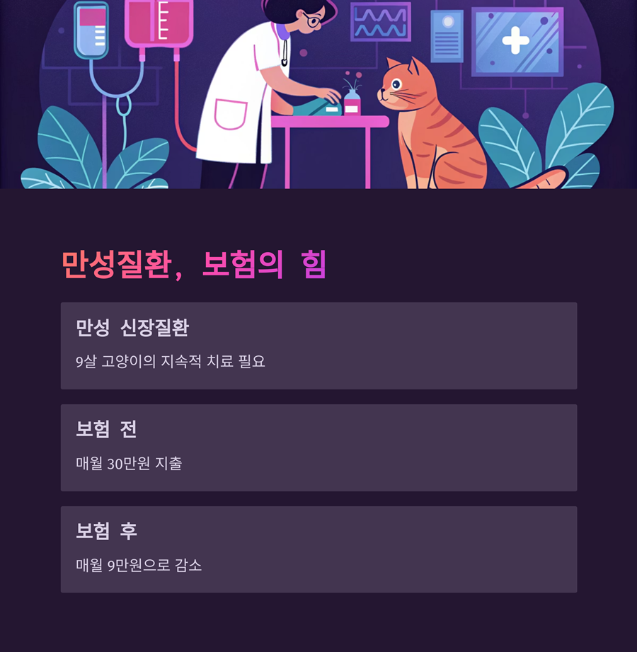 장기적인 치료가 필요한 반려동물에게 보험은 꾸준한 치료 지속을 가능하게 하는 기반이 됩니다.