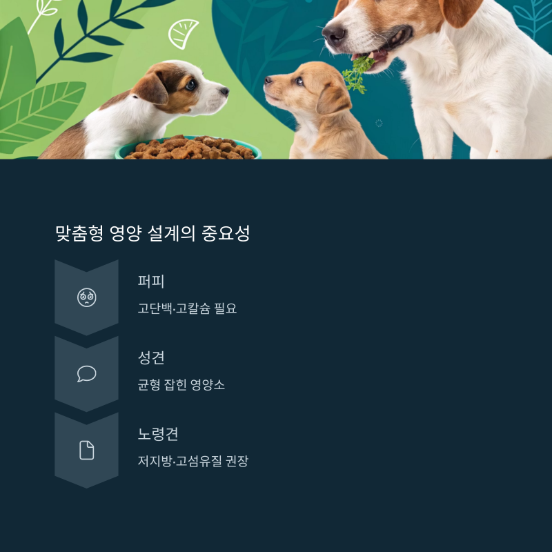 퍼피는 고단백·고칼슘, 노령견은 저지방·고섬유질을 고려해야 합니다.