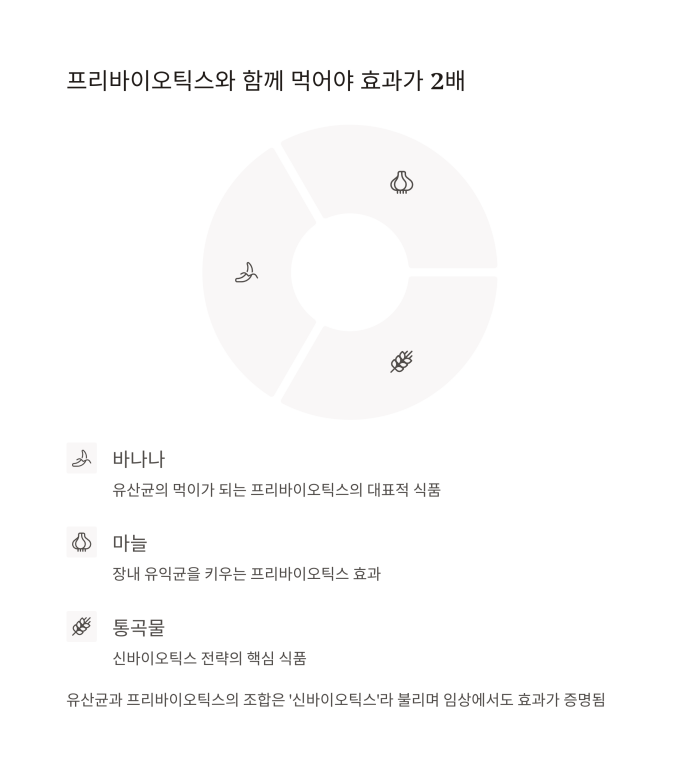 유산균만 섭취해도 효과가 있지만, 프리바이오틱스와 함께하면 시너지가 납니다.