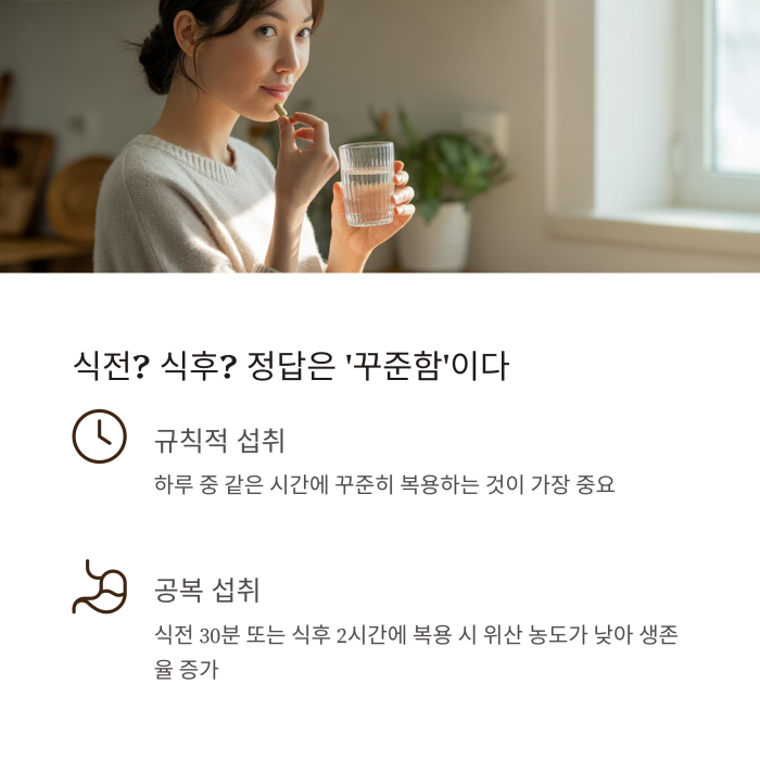 공복 섭취는 위산 농도가 낮아 유산균 생존율을 높일 수 있다는 장점이 있습니다.