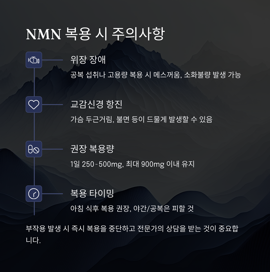 NMN은 대부분 안전한 성분으로 간주되지만, 일부 사용자에게 경미한 부작용이 보고되었습니다.