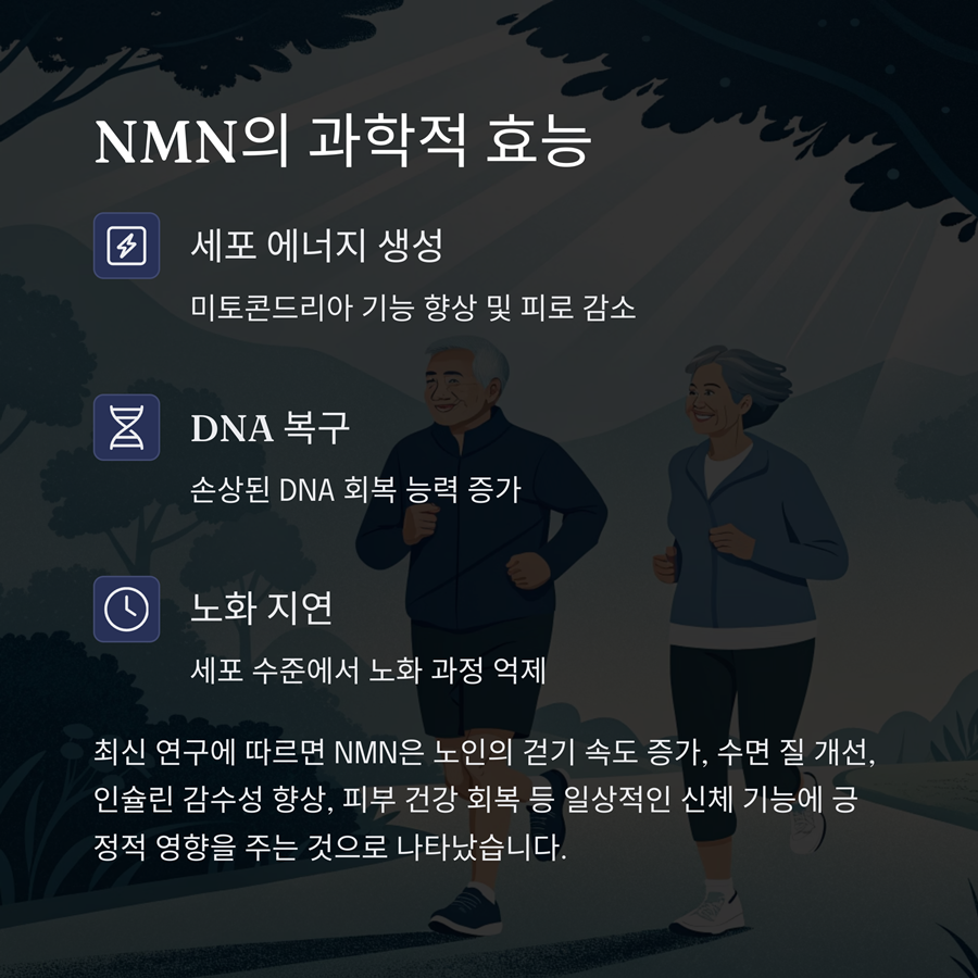2024~2025년 발표된 최신 연구에서는 NMN이 세포 에너지 생성, DNA 복구, 노화 지연에 도움을 줄 수 있다는 점이 강조됐습니다.